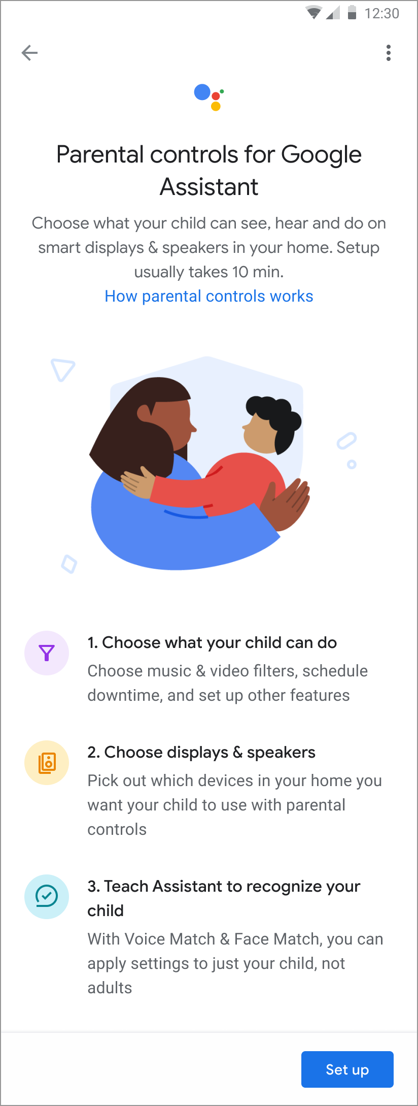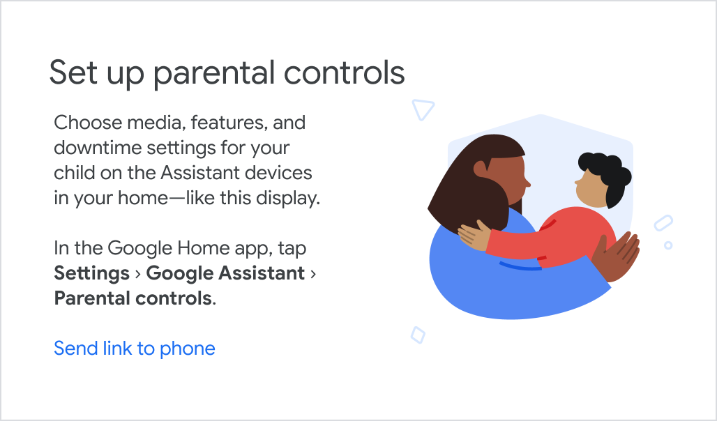 This is the feature announcement card for Smart Displays, a common entry point for Parents as their child(ren) interact with the Assistant in communal spaces. A link to the setup process can be sent to their phone.