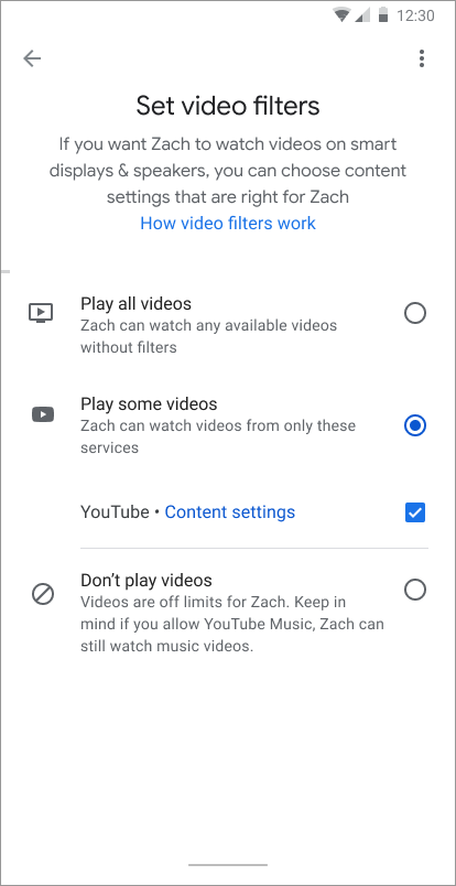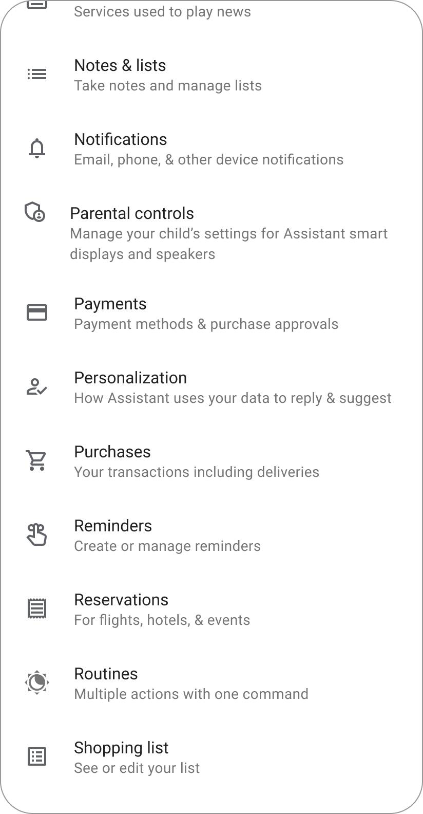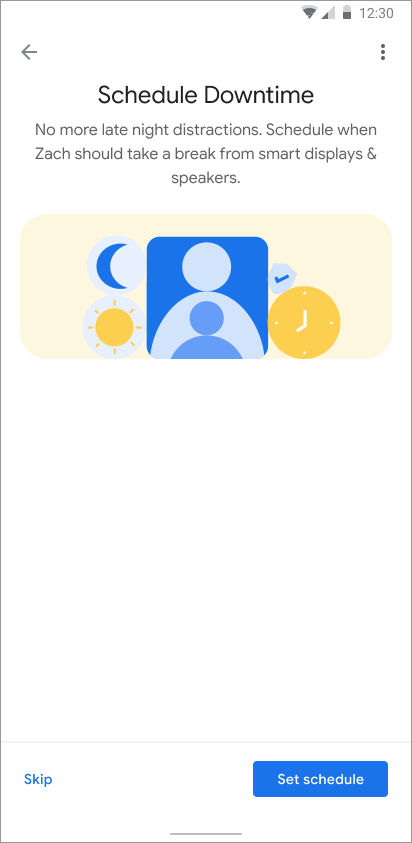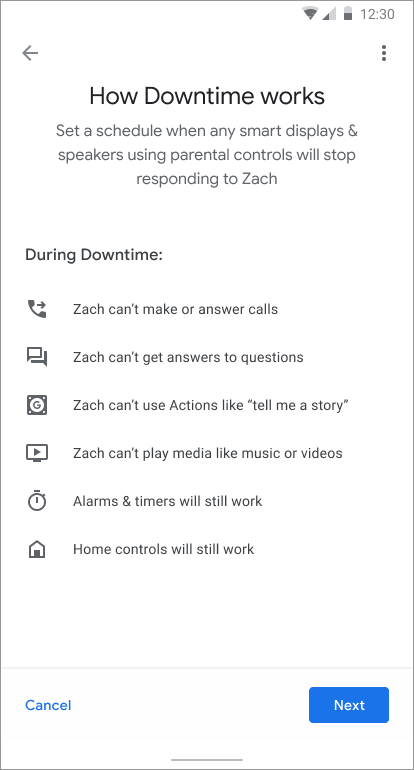 Downtime has been a feature available for parents to use before Parental Controls. It is a highly valued feature, allowing parents to turn off access to Assistant enabled devices for a period of time. We integrated the existing framework for Downtime, so settings can be changed in the Parental Controls setup.