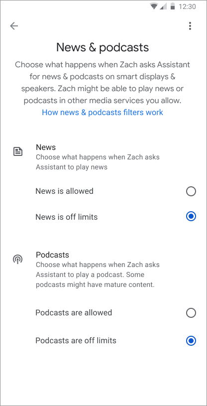 By default, News & Podcasts are off limits. Through UXR we learned parents would likely not change these settings.
