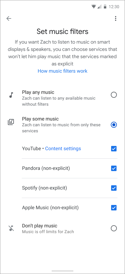 The user has selected to Play some music. 3rd party music apps are selected by default, with clear copy ‘non-explicit’.